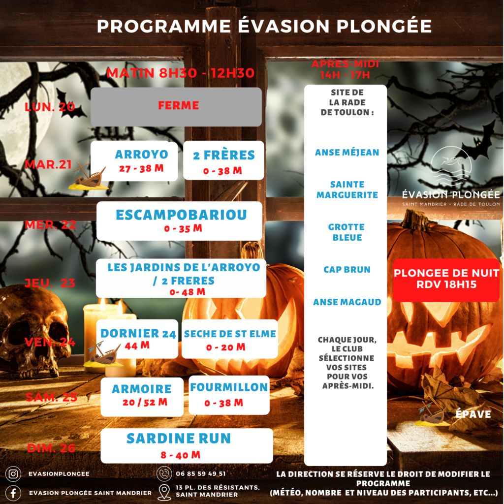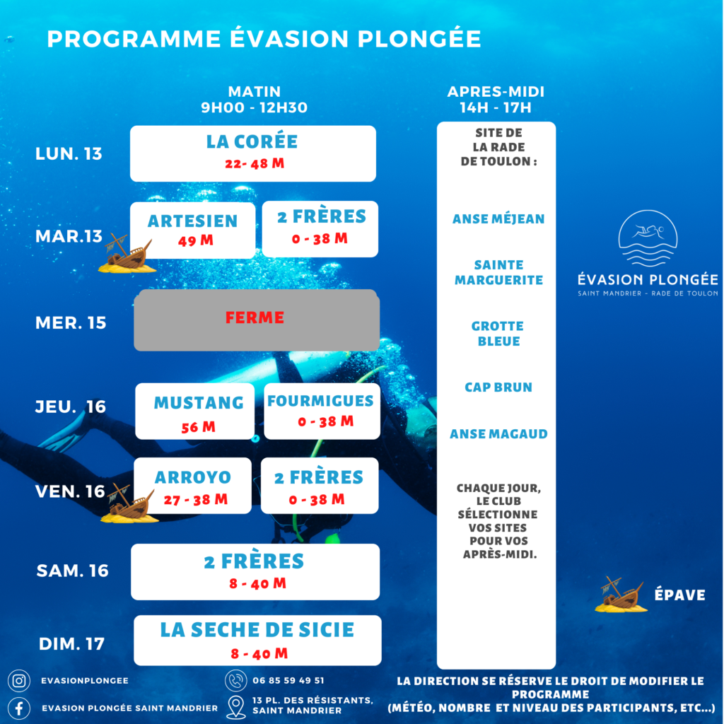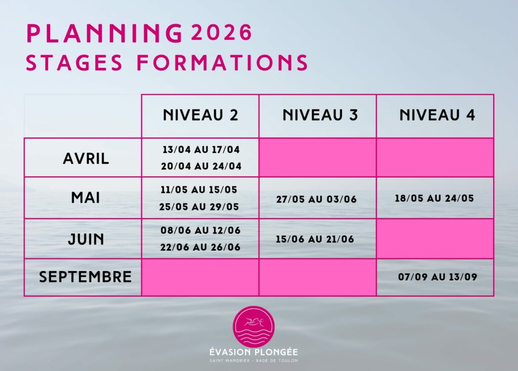 👉 Évasion Plongée poursuit son activité autour de la formation, de l’encadrement individuel et de l’accompagnement personnalisé.