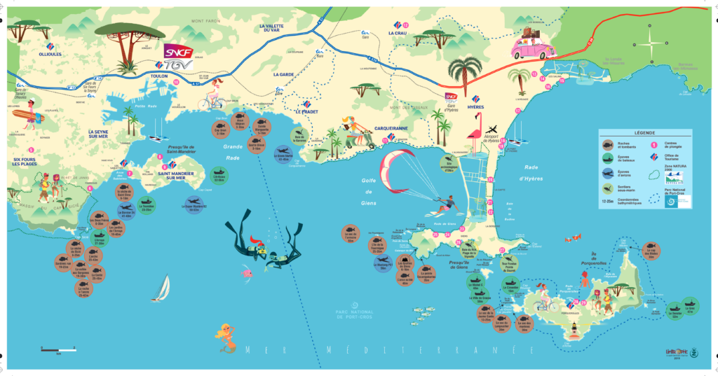 - À l’Est de Saint Mandrier, les possibilités y sont très riches et variées. Du Pradet à Giens en passant par Carqueiranne, les Fourmigues offrent un panel de très belles plongées multi-niveaux, épaves profondes, et roches accessibles dès les débutants.